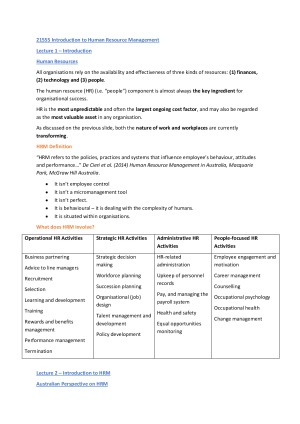 HD Introduction to Human Resources Management (21555) Notes Comprehensive Notes and includes answers to the tutorial questions. Really helpful for the assignments and final group assignment Topic include: Lecture 1 – Introduction Lecture 2 – Introduction to HRM Week 3 - The HRM Lens Lecture 4 - HRM Planning Lecture 5 - Work and Job Design Lecture 6 - Engagement and Retention Lecture 7 - Employee Selection Lecture 8 - Performance Management Lecture 10 - Talent Management Contains Tutorial answers at bottom of notes.