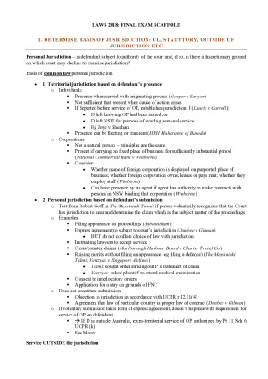 These scaffolds were drafted specifically for the final open book exam. They offer a concise summary of relevant cases and statute and provide a clear methodology to follow when answering exam questions. They cover: basis of jurisdiction, discretionary non-exercise of jurisdiction, anti-suit injunctions, substance of procedure, proof of foreign law, exclusionary doctrines, choice of law in contract and tort and foreign judgments.