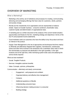 Includes all lecture notes, tutorial notes, textbook notes and extra content. Comprehensive summary of the entire course. Easy to read but detailed. Best for before quizzes revision and for keeping upto date with the course content. Includes the following topics- 1. Overview of Marketing 2. Digital Marketing 3. Ethics, Sustainability and CSR 4. Analysing the Market Environment 5. Consumer Behaviour 6. MarketingResearch 7. Product and Branding Decisions 8. Developing New Products 9. Pricing Concepts for Establishing Value 10. Supply Chain, Channel Management and Retail