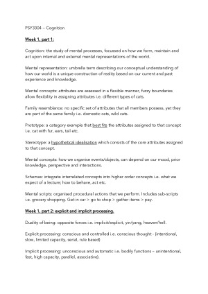 Notes cover all topics week 1 - 12 including processing, priming, unconscious thought theory, attention, memory, forgetting, executive functions, conditioning, reinforcement, skill acquisition, decision making, sex, aggression, communication, creativity, artificial intelligence.