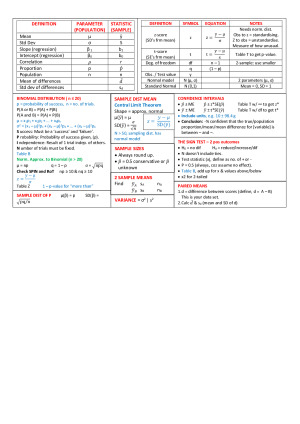 2 Page Exam Cheat Sheet - To be taken into the exam. - Contains all relevant information from Modules 1 to 11. - If you knew nothing going into the exam, this cheat sheet will enable you to pass. It contains an insane amount of information. - All neatly organised into colour-coded individual boxes. - Summary table of symbols, parameters, statistics and formulas. - Step-by-step instructions for every kind of hypothesis test: for proportions, 1 sample mean, 2 independent sample means, 2 paired means, and the chi-square test. - Notes on binomial distributions and the normal approximation to the binomial. - Notes on sample proportions and sample means. Describing distribution: visually and numerically. - The correlation coefficient, correlation coefficient squared, and linear regression lines. - Types of errors, types of samples, types of studies, and types of variables. - Types of Distribution Tables with formulas and explanation. - The law of large numbers. - 5 number summary. - 68–95– rule. - Statistical significance.