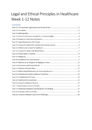 Comprehensive notes for Legal and Ethical Principles in Healthcare. Includes notes for all content from Week 1-12, with a particular focus on information and cases important for the case study and final exam. Topics covered include: * Australian legal System * Precedent * Ethics * Human Rights * Consent (for adults, children, and adults with mental illness or without decision-making capacity) * Negligence * Assisted Suicide * Doctrine of Double Effect * Withholding/Withdrawing Life Support * Criminal Law * Confidentiality/Privacy * Registration * Disciplinary Proceedings * Research Ethics