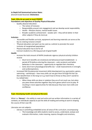 These notes are fully summarised lecture notes from week 1-12 with references to readings, diagrams and images. The lectures are extremely important and crucial for the final exam and the blog posts. Topics included: - Why do we want to teach PDHPE? - Developing health and physical literacies - PDHPE K-10 syllabus - Pedagogical models of physical education - Teaching Physical Education for a purpose - Teaching children to move for life - Re-thinking aquatic movement - Teaching Personal Development and Health in the Primary School
