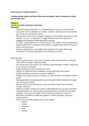 Full summary of entire textbook 'Teaching Quality Health and Physical Education' 2017 by Dudley et al. This is a required reading for even just wanting to pass the unit as the blog posts and final exam are based on evidence from the textbook. Topics include: - Introducing Health and Physical education - Understanding quality health and physical education - Overview of Australian Curriculum - Authentic learning and assessment - Pedagogies - Exploring identity - Healthy relationships - Whole school approaches to promoting health - Planning for developmentally appropriate learning - Moving for purpose - Moving for life