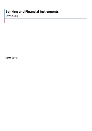 List of topics: Module 1 - Legal Supervision of Banks and ADIs Module 2 - Cheques, Payments and Concept of Negotiability Module 3 - Basic Principles of Bank Lending & the ADI/Customer Relationship Module 4 - Duties & Liabilities of Banks & ADIs Module 5 - An Introduction to Guarantees, and Other Documents Imposing Payment Obligations Module 6 - Bills of Exchange Module 7 - Security for Debt Highly detailed notes incorporating readings from prescribed course materials.