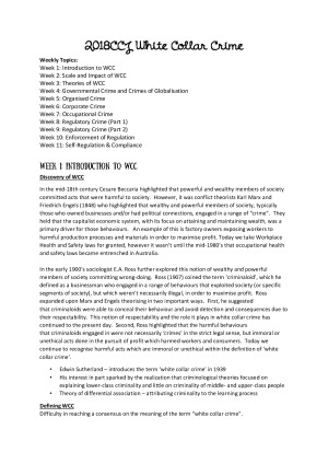 These notes contain summaries from the content covered in all weeks of this course. They also contain notes from the readings within the weekly summaries. Week 1: Introduction to WCC Week 2: Scale and Impact of WCC Week 3: Theories of WCC Week 4: Governmental Crime and Crimes of Globalisation Week 5: Organised Crime Week 6: Corporate Crime Week 7: Occupational Crime Week 8: Regulatory Crime (Part 1) Week 9: Regulatory Crime (Part 2) Week 10: Enforcement of Regulation Week 11: Self-Regulation & Compliance This was a hard subject, and I would highly recommend focusing during lectures and taking good notes. Use these as a foundation for exam revision, and good luck with all your further studies!