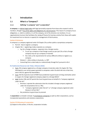 Comprehensive and well-organised notes based on lectures, textbook and readings. Received a Distinction grade for the course. The content of the notes are as follows: -Class 1: Introduction: history and theory; regulatory overview -Class 2: Company formation; business structures and types of companies -Class 3: Corporate fundraising: debt and equity -Class 4: Corporate insolvency: overview of Ch 5; winding up and statutory demands -Class 5: Corporate personality and limited liability -Class 6: Corporate personality and limited liability -Class 7: The Corporate constitution -Class 8: Corporate decision-making organs -Class 9: Member’s meetings -Class 10: General law liability in contract and tort -Class 11: Statutory civil liability -Class 12: Corporate criminal liability -Class 13: Directors’ and officers’ duties I: duty of good faith and for a proper purpose -Class 14: Directors’ and officers’ duties II: conflicts and secret profits -Class 15: Directors’ and officers’ duties III: conflicts (continued); statutory regulation of conflicts; related-party transactions -Class 16: Directors’ and officers’ duties IV: the duty of care, skill and diligence -Class 17: The duty to avoid insolvent trading -Class 18: Members’ rights and remedies 1 -Class 19: Members’ rights and remedies 2