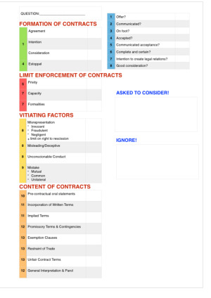 Student had GPA of at time of preparation - has recently graduated 2nd in cohort (from 537) Do not be scared by the size. These notes have been separated out so as not to be cluttered and allow for easy readability. They can easily be printed 2 per page. These notes have been prepared with the utmost clarity. The entire document is easy to follow, with clear structures delineated at the beginning of each section in a clear red table. Headings are colour coded throughout, with elements clearly separated. All details have been tabulated, meaning authorities and facts are clearly separated. Whether something is satisfied or not is clearly identified through a 'yes' or 'no' box in green or red, allowing you to easily filter through in an exam. A random selection has been chosen for the examples. The sample first page is a table of contents which I conveniently used as a 'tick sheet' in exams. This way, when I would read a question, I could go through and tick the relevant issues as I identified them - meaning when writing answers I could ensure I hit all relevant issues. Notes have been prepared as individual docs and merged, meaning the page count at the bottom of each individual section is "page 1 of x". That way, when working through a template in an exam, you know how many pages you have to get through to complete a question.