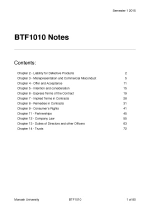 BOTH NOTES AND CASE SUMMARIES IN THE ONE PDF. NOTES Full comprehensive notes from Semester 1 2015, including a contents page. Everything covered in classes as well as all required learning from the textbook that wasn't covered in the classes. I wrote this, bound it, and used it in the exam as my guide and I found this assisted me a lot throughout the exam. Covers Chapters 2&3 (Required for Mid-Semeter Exam) and Chapters 4-14 (Required for End of Year Exam) CASE SUMMARIES Full comprehensive case summaries from Semester 1 2015, including full contents of every case categorised by chapter from the text book . Highlighted in Pink are the important things to take away from each case. I wrote this, bound it, and used it in the exam as my guide and I found this assisted me a lot throughout the exam. Covers Chapters 4-14 (Required for End of Year Exam)