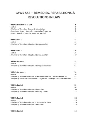 LAWS555 Distinction Grade - Remedies, Reparations and Resolutions in Law - Full lecture and reading notes