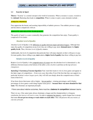 This comprehensive theory book, with a selection of equations and graphs, clearly and succinctly explains the principles of Sports Economics. As you progress through the unit, use these notes in conjunction with your own note construction - sports economics graphs and diagrams - and you are bound to achieve good results. Best of luck, and enjoy! Topics covered include: 1. Microeconomic Principles and Sport 2. Economics of Sport Broadcasting 3. Profit-Maximising Sports Franchises 4. Sports Events and Leagues Behaviour 5. Competitive Balance 6. Labour Markets in Professional Sport