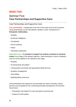 Complete and comprehensive notes complied from readings, videos and ILO’s from HNN319 - Nursing Management of Chronic Illness. Outlines and summarises weekly content and ILO's in easy to understand language, perfect for exam preparation. Content included but not limited to in notes: - Models of Care - Psychosocial Impacts - Nursing Management - Stroke and TIA’s - Chronic Heart Failure and Congestive Heart Failure - Motivational Interviewing and Health Coaching - T1DM, T2DM - Health Literacy - Rheumatoid Arthritis and Osteoporosis - Palliative and End of Life Care