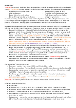 Notes include lecture slide materials and any additional information covered in tutorials. Topics Covered: 1. Introduction to Financial Accounting 2. Measuring and Evaluating Financial Position and Financial Performance 3. The Double Entry System 4. Record Keeping 5. Accrual Accounting Adjustments 6. Financial Reporting Principles, Accounting Standards and Auditing 7. Internal Control and Cash (Cash and Accounts Receivable) 8. Accounts Receivable and Further Record-Keeping 9. Inventory 10. Non-Current Assets 11. Financial Statement Analysis 12. Introduction into Management Accounting 13. Management Accounting Systems and Organisational Strategies 14. Cost-Volume Profit (CVP) Analysis