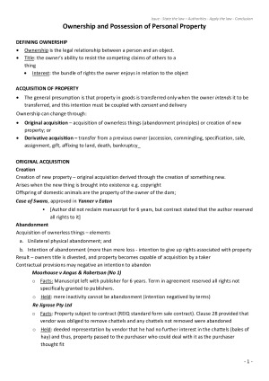 Comprehensive CPP Law Exam Notes. Very easy to read/ navigate in exam conditions. Achieved a 7 on the final exam using these exact notes. Includes: All relevant information from prescribed readings Full case summaries for all prescribed and recommended cases Topics: The Concept of Property Fixtures and Chattels Ownership and Possession of Personal Property Possession and Remedies for Interference with Possession Bailment Agency Misleading or Deceptive Conduct Sale of Goods Act and Implied Terms Transfer of Personal property Under a Contract of Sale Transfer of Title by a Non-Owner Performance of the Contract and Remedies Consumer Guarantees - Goods Consumer Guarantees - Services