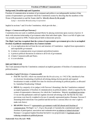 Comprehensive Constitutional Law Exam Notes Very easy to read and navigate in exam conditions Achieved a mark of 7 on the final exam, using these exact notes Includes: Full case summaries for prescribed and recommended cases All relevant information from prescribed readings Content: Constitutions and Institutions of Government Requirement for Direct Choice of Members and Implications From It Freedom of Political Communication Freedom of Association Right to vote Trade and Commerce Power Corporations Power External Affairs Aliens and Immigration Defence Power Race Power Taxation, Spending and Grants Grants to States Spending Power Acquisition of Property on Just Terms Prohibition on Discrimination and Preference Jury Trial Freedom of Religion State Constitutions Extraterritoriality Express Limits in Commonwealth Constitution on State Power Freedom of Interstate Trade and Commerce Freedom of Interstate Intercourse Prohibition on Discrimination Against out of State Residents Inconsistency Separation of Judicial Power Independence of State Courts Limit on State Laws Affecting State Courts