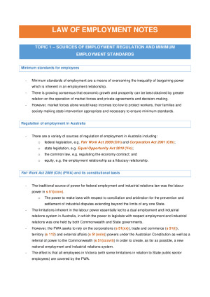These notes follow closely with lecture commentary from Chief Examiner and highlight key discussion points. Topics included in these notes: 1 - Sources of employment regulation and minimum employment standards 2 - The context and nature of working arrangements for employees and independent contractors 3 - Forming an employment contract 4 - Terms of the employment contract 5 - The employee's implied duties 6 - The employer's implied duties 7 - Unfair dismissal 8 - Termination and remedies 9 - General protections under the FWA 10 - Anti-discrimination and bullying protections