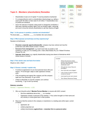 These extensive notes include information from seminars, all the podcasts, various textbooks and further online research compiled into an easily read, format for the final exam. Case summaries included. The notes are structured as scaffolds so you simply need to follow the step by step instructions to answer any problem question in the final exam. This clear and detailed structure means you won't have to look through lots of bulky notes and potentially get confused during the exam. All Exam Topics Covered: Duty: Care and diligence Duty: Good faith and proper purpose Duty: Conflict of interest Duty: Prevent trading while insolvent Members Remedies Companies in Financial Distress Audit and Reports