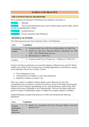 Covers the following topics Topic 1: Introduction - Concept of Family Topic 2: Family Law Practice - Constitutional Framework - Jurisdictional Framework Topic 3: Consent Orders and Binding Financial Agreements Topic 4A: Alteration of Property Interests under the FLA - Dispute Resolution - Introduction to Part VIIIAB - Financial Matters Relating to De Facto Relationships - Property and Financial Resource - Declaration of Property Interests - Dividing Property - Structured Approach to Division of Property Topic 4B: Assessing Contributions - Financial Contributions - Homemaker Contributions - Relationship between Property Division and Conduct - Prospective Factors Topic 5: Spousal Maintenance - Time for Commencement of Proceedings - The Relationship between Property Settlement and Spousal Maintenance - Relevant Provisions - Ousting Court's Jurisdiction - The Form of Spousal Maintenance Orders Topic 6: Part VIIIB Superannuation - Categories/Background - When are Benefits Payable? - Pre and Post 2002 Reforms - General - Court Orders - Part VIIIB Div 3 - Applying the Legislation Topic 7: Injunctions Restraining the Disposition of Property - Independent Injunctions - Ancillary Injunctions Topic 8: Orders and Injunctions against Third Parties - Third Party Interests and s 79/s 90SM Proceedings - Control - Part VIIIAA Orders and Injunctions Binding Third Parties Topic 9 - Setting Aside Transactions to Defeat Claims s 106B OTHERS - Inclusive of case summaries for each topic - Went straight to the legislation to make my notes - My notes are summaries of the legislation, required readings and lecture slides laid out in an organised manner and with clear headings and structure