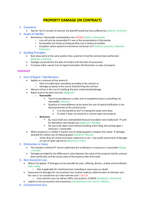 Easy to read, colour-coded notes organised into topics, making them the ideal notes for answering the problem questions in the exams as they run through every step required to answer the question. They are also very useful for tutorial participation and the assignments a they include the information from the textbook, lecture slides and relevant cases. Topics Covered: - property damages (in contract) - property damage (in tort) - trespass to land / to person - negligence + negligent misstatement and deceit - breach of contract - equity: specific performance - injunctions - rescission (in common law and in equity) - rectification - misleading or deceptive conduct (s 18 ACL) - damages under s 236 - remedies under s 237 - restitution