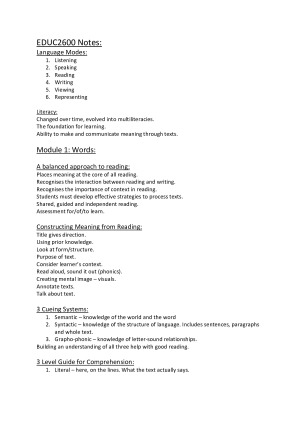Simple and clear exam notes that cover topics in EDUC2600. Topics covered: Module 1: Words Module 2: Texts Module 3: Sounds Module 4: Images