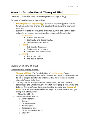 High-quality comprehensive subject notes created from all lectures. Important tables, external research and definitions have also been integrated to enhance an overall understanding of course material. Topics covered: Week 1: Introduction & Theory of Mind Week 2: Cognitive Development & Infancy Week 3: Core Knowledges & Tools for Thought Week 4: Intelligence & Statistics Week 5: Language Development Week 6: Grammar & Self-understanding Week 7: Socioemotional Development Week 8: Family Development Week 9: Peer Development & Human Genetics Week 10: Genetics & Prenatal Development Week 11: Brain Development Week 12: Conclusions