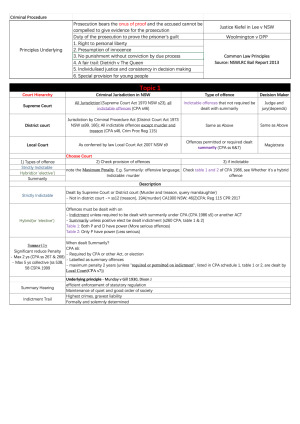 Content include: > Criminal 1. Introduction to Criminal Procedure 2. Police Powers and Discretion 3. Bail and Appeals 4. Pre-Trial Process, Decision to Prosecute 5. Sentencing and Punishment > Civil 6. Process, open justice 7. Preceding Litigation & Commencing Proceedings 8. Pleadings and Particulars, Gathering Evidence 9. Opposing Disclosure 10. Trial or No Trial * For Final Exam ONLY. * Includes all key points. Note: not ideal for class preparation. Because I deleted everything for understanding and not examinable for exam.