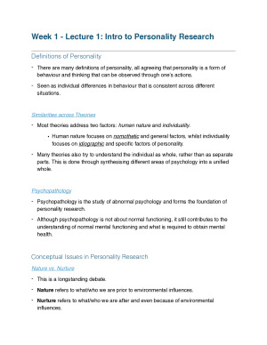 All lectures covered - I received 87 in this unit using these notes alone. Usually two lectures per week. Week 1: Introduction Week 2: Post-Freudian approaches + Attachment theory and personality Week 3: Neuropsychoanalysis + Trait Approaches Week 4: Evolutionary Theory and Personality + Humanistic Psychology Week 5: Personal Construct Theory + Revision Week 6: MIDSEM EXAM - NO LECTURES. Week 7: New Directions + Personality Theory Week 8: Social Psychology Week 9: The Social Self + Person Perception Week 10: Attributions + Errors and Biases Week 11: Emotion + Disgust Week 12: Group Influence Week 13: Power and Status + Exam Prep