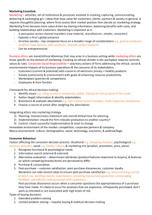 Notes contain content from lecture slides as well as any additional information provided by the lecturer. Topics covered: 1. Marketing Essentials 2. Consumer Behaviour 3. Segmentation, Targeting and Positioning 4. Marketing Research 5. Product & Branding Decisions, and Developing New Products 6. Services 7. Pricing 8. Supply Chains 9. Digital Marketing 10. Integrated Marketing Communications