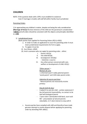 Based on Kelly's tutes! Notes + flow charts + case summaries These notes are complete and comprehensive including step by step guide to answering problem questions on children, de facto, marriage, divorce, property! *Including updated answering process since Stanford v Stanford*