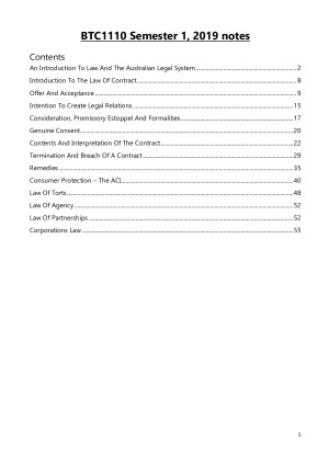A set of comprehensive notes compiled from the textbook, lectures and tutorials. It has a table of contents which detail the following topics: An Introduction To Law And The Australian Legal System Introduction To The Law Of Contract Offer And Acceptance Intention To Create Legal Relations Consideration, Promissory Estoppel And Formalities Genuine Consent Contents And Interpretation Of The Contract Termination And Breach Of A Contract Remedies Consumer Protection – The ACL Law Of Torts Law Of Agency Law Of Partnerships Corporations Law Please note that this document does contain some shorthand, but this should be fairly well-known, or clear from the context.