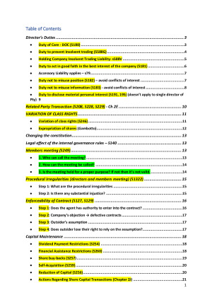 This is my comprehensive cheat sheet for Corporate Law exam I used for my exam. The formatting is designed to be intuitive and helpful. As long as you take your time to understand the structure and formatting, the cheat sheet should be a great guide for your exam. Topics covered: - Director's Duties - Related Party Transactions - Variation of Class Rights - Members meetings - Procedural irregularities - Enforceability of Contract - Capital Maintenance: Dividend payment restrictions, financial assistance restrictions, share buy-backs, self-acquaintances, reduction of capital, actions regarding share capital transactions - Members personal actions - Members' remedies: Procedural irregularities, Variation of Class Rights, Oppression Remedy, Court Ordered, Court Order Winding Up, Statutory Injunction, Derivative Actions