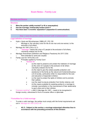 Covers all lectures, readings, case summaries and problem scenarios Topics: Marriage and Divorce (valid marriage, presumption of marriage, void marriages, divorce - irretrievable breakdown, 12 months separation, separation, resumption of cohabitation; Parenting orders (ESPR, abuse and violence, s 60CC and best interests of the child, equal time and substantial and significant time, other orders made, full and frank disclosure); Property settlement (what is the property, Stanford v Stanford considerations, global pool or asset by asset, family violence considerations, assessing and balancing contributions, parties needs (s75(2) and s90SF(3), just and equitable orders.