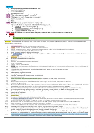 1- EXECUTIVE 2- LEGISLATURE 3- JUDICIARY 4- LEGISLATIVE PROCEDURE 5- INTERPRETATION/ CHARACTERISATION 6- INCONSISTENCY AND INTERGOVERNMENTAL IMMUNITIES 7- FINANCIAL AND ECONOMIC POWERS 8- EXPRESS AND IMPLIED RIGHTS UNDER THE CONSTITUTION 9- SEPARATION OF JUDICIAL POWERS Summary of content developed in the form of a step by step/ road map guides. Legislation and cases used whilst keeping things simple. All things highlighted to be examinable discussed. Legislation: - Commonwealth of Australia Constitution Act 2001 (Cth) - Constitution Act 1975 (Vic) Colour used to make it easier to read.