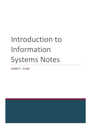 These notes are for the subject Introduction to Information Systems - 31266, studied at the University of Technology Sydney. These were written in 2019 Spring session and were used to score a 95/100 mark or a HIGH HD. Covered in these notes are: Week 2: Introduction to Information Systems (IS), data, information and knowledge. Week 3: Learn about different Information Systems that support every level of a company. Week 5: Information System's role in the evolving state of business, such as market and technology pressures. Learn about Value Chain. Week 7: Learn about Data and Knowledge Management. This includes Databases and issues with traditional file systems. Week 8: Learn about threats to Information Systems. The different types of threats, where they come from, and how to prevent/mitigate damage to an organisation. Week 9: Ethics and Privacy in the world of Information Systems. Week 10: Learning about Telecommunications and Networks. The basics of how networks function, and the best application of networks for businesses. Week 12: Acquiring Information Systems and Applications. The planning and implementation process of developing new information systems for business. This includes updating an existing system. Learn about Systems Development Life Cycles and the planning procedures. The notes contain a title page a table of contents with each important topic. The document is 47 pages in total. With 10 weeks of important learning, this brings it to only 5 pages a week to learn!!! Some weeks are missing as they are not important in getting a High Distinction in the subject. Week 1 is just introducing you to the subject outline, and weeks 4 & 6 are guest speakers that are not repeated in the quizzes or exams. Hope you find them useful and good luck with your studies :)