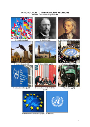 The world is even crazier when you're a student of political science. These are the notes that include my blood, sweat, and tears. If you don't like those things, they also include: - Full comprehensive notes on POLS1201 for all weeks - Title page with page numbers to find relevant topics - Each topic also has its own "contents box" to find specific information - Notes from lecturer, textbook, and weekly readings are colour-coded and easily distinguishable - Am happy for anyone who purchases these notes to have my contact details in case there are any questions Topics Include: 1. Introduction to International Relations 2. Theories: Realism 3. Theories: Liberalism 4. Theories: Constructivism 5. Human Rights 6. Security and War 7. International Law 8. International Order/Cold War's End 9. Terrorism and Insurgency 10. International Institutions