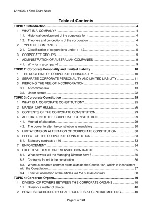 These LAWS2010 notes are a compilation of class notes, textbook notes, and case readings. They are comprehensive and step through every topic of the course in detail, allowing me to achieve an 84 (Distinction) overall. The notes are well-formatted, up to date and structured by topic, including: - Key points from lectures - Detailed case outlines with key conclusions - Relevant legislation extracts - Diagrams and flow charts where helpful Topics include: 1. Introduction 2. Corporate Personality and Limited liability 3. Corporate Constitution 4. Corporate Organs 5. Binding the Corporation 6. Directors' Duties (Duty to act in good faith, duty to exercise powers for a proper purpose, statutory duties, duty to avoid conflict, duty of care, statutory business judgment rule) 7. Members' Rights and Remedies