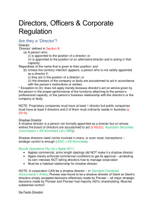 Contains: - Directors, Officers & Corporate Regulation - Overview of Director's Duties - Duty of Care, Skill & Diligence - Duty of Good Faith and Proper Purpose - Conflict of Interest - Members' Remedies