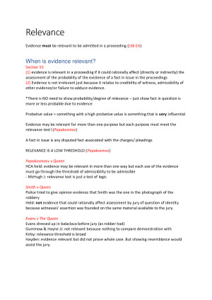 Notes from University Medalist Contain: - Relevance - Privilege - Documentary and real evidence - Witnesses: competence and compellability - Credibility evidence: the exclusionary rule and exceptions. - Hearsay - Opinion evidence - Tendency and coincidence evidence; the exclusionary rule and conditions for admissibility.