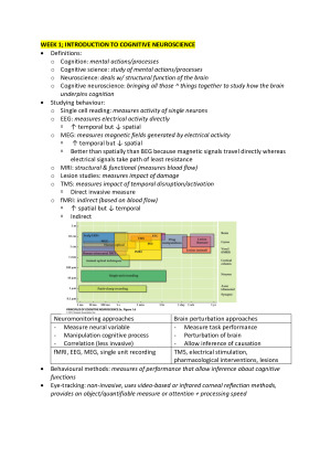 Grade: HD (88) Also known as: COGS202 (Cognitive Neuroscience) under old curriculum Highly organised, detailed and simplified notes from Session 1 2019. For a subject that is very content heavy and as a result, highly challenging, these "mass summary notes" are a game-changer. They cover all the relevant content/detail, but are simplified in a way that makes studying for this subject a lot easier. *These notes exclude majority of the pictures/diagrams presented in the lectures, as they are the intellectual of MQU. However, you should easily be able to find them in the lectures, as all the topics & descriptions of such pictures still remain in the notes :)) Topics covered: - Introduction (Wk 1) - Vision (Wk 2) - Audition (Wk 3) - Mechanical & chemical senses, cross-modal interaction & synaesthesia (Wk 4) - Attention (Wk 5) - Emotion (Wk 6) - N/A for Wk 7 (mid-sem) - Social cognition (Wk 8) - Memory (Wk 9) - Motor planning, learning & adaptation (Wk 10) - Motor systems (Wk 11) - Language (Wk 12) - N/A for Wk 13 (revision week)