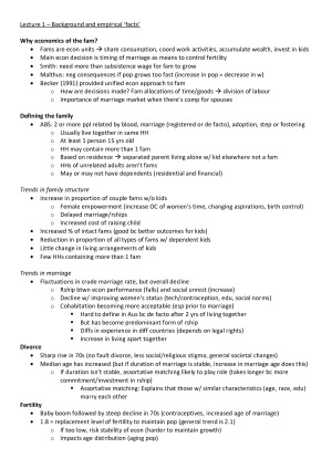 Final exam notes for ECOS3027 (2019) Topics included: 1 – Background and empirical ‘facts’ 2 – The family as an economic unit: theories 3 – The family as an economic unit: empirical evidence 4 – Marriage and partnering: trends and theories 5 - Why divorce, what are the consequences, and how does divorce law affect behaviour? 6 – Family violence 7 - Fertility – empirical evidence and theories 8 - Fertility – empirical evidence and theories II 9 - Fertility: Public policy (financial incentives) III 10 - Fertility: Public policy (parental leave and childcare) IV 11 - Discrimination