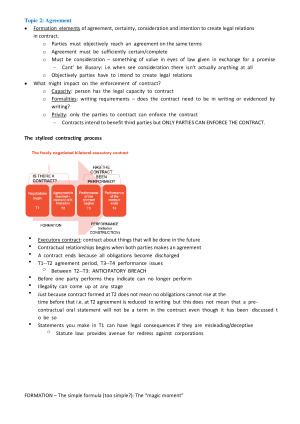 Comprehensive notes for Contracts covering all topics in the Unit of Study Outline Notes include all relevant authorities and materials from prescribed readings and an accumulation of other HD notes. Scaffolding is used to provide a basic backbone with relevant authorities making the topic clearer and easier to break down. Structure for problem questions for difficult topics is included at the end of the file: - Is there an enforceable contract - Intention to create Legal Relationship and Formalities - Estoppel - Express Terms: Promises vs representations, incorporation of terms by signature, notice, course of dealings - Implied Terms: Terms implied in law, fact and custom and usage - Construction - Exclusion Clauses and Privity - Discharge by performance and by agreement - Discharge for breach and repudiation - Solving a Breach/Termination Problem - Process and Effect of Termination - Discharge by Frustration - Solving a Frustration Problem Question