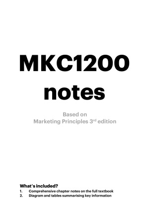 These notes were carefully crafted and used throughout the semester and the final exam to score 82% on the unit. Included in this document you will find: • Comprehensive chapter notes on all chapters used in the subject (Marketing Principles 3rd edition) • Diagrams to illustrate and summarise key information Please enjoy these notes and good luck for the unit. I hope you find it as enjoyable as I did!