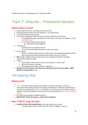 ** Very comprehensive and thorough exam notes for LAW5014 Principles of Administrative Law (Admin) course ** Topics covered: - Introduction and overview of government structure, principles and foundations - Merits Review - Jurisdiction - Standing - Reasons - Grounds: Acting outside power - Grounds: Procedural fairness - Grounds: Jurisdictional error - Remedies - Privative Clauses