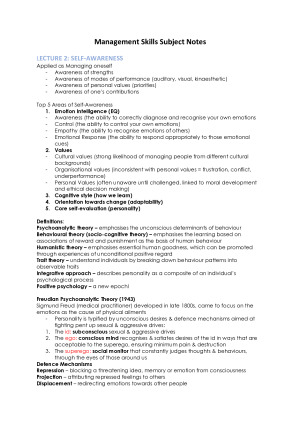 SPRING SESSION 2019 SUBJECT NOTES - Detailed yet easy to read and comprehend - Notes derived from lectures, tutorial work, and compulsory readings Topics covered: - Lecture 2: Self-Awareness - Lecture 3: Character Strengths - Lecture 4: The Brain - Lecture 5: Managing Emotions - Lecture 6: Mindfulness - Lecture 7: Stress, Optimism and Resilience - Lecture 8: Wellbeing, Positive Mental Health - Lecture 9: Appreciative Inquiry - Lecture 10: Authentic Leadership - Lecture 11: Organisational Compassion