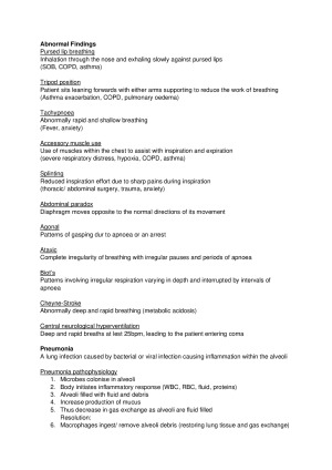 These Notes cover the whole unit outline from the course. Quick Tip! Having a brief understanding of the information will help when completing the case studies and questions in the exam. The exam i sat was quite lengthy so knowing your info is really important. Topics covered include: Physical assessment * primary and secondary *Physical assessment techniques (IPPA) Airways and breathing *respiratory assessment (primary, secondary data) * abnormal findings (12 findings listed - agonal, tachyponea, ataxic etc) * Pneumonia (pathophysiology - 6 steps) *Hypoxia (definition, clinical presentation and managing) *Asthma (definition, clinical presentation, managing and preventing) *Pneumothorax Circulation *Perfusion *cardiac cycle (systole, diastole, preload, afterload, contractility) *Perfusion assessment (primary and secondary data) *Abnormal findings *Assessment the precordium *Circulation problems *Warning signs of cardiovascular problems *Acute coronary syndrome (ACS) - physiology *Angina Pectoris - physiology *STEMI and NSTEMI *supply and demand *Managing ACS *Heart failure Disability * 7 components * consciousness *unconsciousness *assessing neurological disability (AVPU and GCS) * neurological observation chart *neurological assessment , history, cognitive assessment, cranial nerve assessment, motor assessment, sensory assessment *abnormal neurological findings *nursing implementations Exposure (wound assessment and care) * wound *key parameters of wound * exudate, appearance, edge etc * Leg ulcers - venous ulcers, arterial ulcers etc *Further wound investigations * Principal reasons for dressings *wound bed prep *wound dressing Fluids *distribution *function of water *electrolytes *fluid movement *ADH *fluid status *fluid imbalances *fluid assessment *fluid volume deficit and overload *intravenous therapy *IV therapy assessment *types of IV devices *IV therapy complications Glucose *diabetes (type 1 and 2) *diabetes risk groups *functions of insulin *clinical presentation (3Ps) * Diagnostic findings *acute complication of diabetes *hypoglycaemia - causes, symptoms, managing, *DKA *diabetes long term complications *nursing care renal function * renal hormones *RAA mechanism, *anti-diuretic hormone *impaired renal function *acute kidney injury *chronic kidney disease Abnormal gastrointestinal assessment *GI system *GI assessment *GI symptoms *GI contraindications *Hepatic dysfunction *Common GI problems *Nasogastric tubes