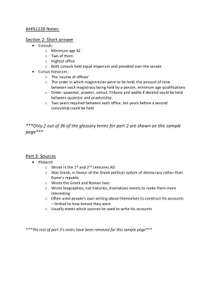 Simple and clear exam notes that cover sections 2 and 3 of the final exam for AHIS1220. Section 2: Short answer - glossary of key terms Section 3: Sources - key points about ancient sources These notes can also be used as a basis for AHIS2220 (with some additions) if continuing Roman History units.
