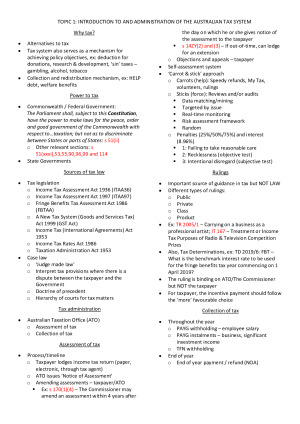 This is the full comprehensive notes for the subject BLAW30002 Taxation Law I which I have completed during the second semester of 2019 at the University of Melbourne. For your information, the final exam for this subject is an open book examination, so you are allowed to bring the textbook as well as additional notes into the examination hall during the final exam. To be honest, you may not have enough time to refer to the textbook in this limited time, therefore a well-prepared set of notes will be very helpful while you sit for the final exam. This notes consist of the following materials:- Topic 1: Introduction to and Administration of the Australian Tax System Topic 2: Tax Payable, Introduction to Income Topic 3: Income from Services Topic 4: Taxation of Fringe Benefits (FBT) Topic 5: Income from Business Topic 6: Income from Property Topic 7: Taxation of Capital Gains Topic 8: Jurisdiction to Tax Topic 9: Deductions Topic 10: Taxation of Partnerships, Trusts and Companies Topic 11: Goods and Services Tax *I have achieved a H1 (93%) in this subject. Hope you enjoy Taxation Law and have a nice day ahead! :)