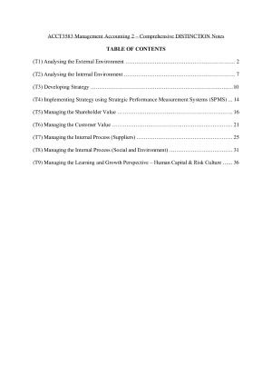 These DISTINCTION notes provide a detailed overview of the entire terms course content. By reading and studying these notes, which were compiled with reference to weekly prescribed readings, lecture slides and tutorial content, you will be able to deepen your understanding of the ACCT3583 course concepts and hopefully improve your final results. Content included: Topic 1: Analysing the External Environment Topic 2: Analysing the Internal Environment Topic 3: Developing Strategy Topic 4: Implementing Strategy using Strategic Performance Measurement Systems Topic 5: Managing the Shareholder Value Topic 6: Managing the Customer Value Topic 7: Managing the Internal Process (Suppliers) Topic 8: Managing the Internal Process (Social and Environment) Topic 9: Managing the Learning and Growth Perspective – Human Capital & Risk Culture