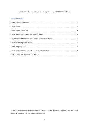 These Distinction notes provide a detailed overview of the entire terms course content. By reading and studying these notes, which were compiled with reference to weekly prescribed textbook readings, lecture slides and tutorial content, you will be able to deepen your understanding of the LAWS3751 course concepts and hopefully improve your final results. Additionally, as the final exam is open book, this set of notes provides a great foundation for exam revision as it references all of the main legislative provisions and all key cases covered in the course which are frequently examined. Content included: (W1) Introduction to Tax (W2) NO CLASS (Public Holiday) (W3) Income (W4) Capital Gains Tax (CGT) (W5) General Deductions and Trading Stock (W6) Specific Deductions and Capital Allowances/Works (W7) Partnerships and Trusts (W8) Company Tax (W9) Fringe Benefits Tax (FBT) and Superannuation (W10) Goods and Services Tax (GST)