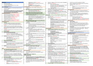 These notes are a comprehensive scaffold of the law of torts subject, which were used to achieve a high distinction. The torts exam is a restricted book exam and you are only allowed 2 double sided pages of notes. These notes are therefore a comprehensive summary of all relevant topics, condensed into 4 pages. The notes cover the following areas: 1. Negligence a. Duty of care i. Established duty situations ii. Established duty areas iii. Novel duty situations iv. Pure mental harm v. Pure economic loss vi. Vicarious liability vii. Non-delegable duties viii. Atypical plaintiffs b. Standard of care i. Legal standard of care ii. Negligence calculus iii. Reasonable person test c. Statutory authorities d. Causation i. Factual causation ii. Scope of liability e. Defences i. Contributory negligence ii. Intoxication iii. Voluntary assumption of risk iv. Obvious risk v. Inherent risk vi. Recreational activity vii. Dangerous recreational activity viii. Serious criminal activity 2. Intentional torts a. Actions involving people i. Assault ii. Battery iii. False imprisonment b. Actions on the case i. Wilful infliction of nervous shock ii. Wilful infliction of physical harm c. Actions involving land i. Trespass to land d. Actions involving goods i. Trespass to goods ii. Conversion iii. Detinue e. Defences i. Self defence ii. Consent iii. Necessity iv. Other defences 3. Essay topics
